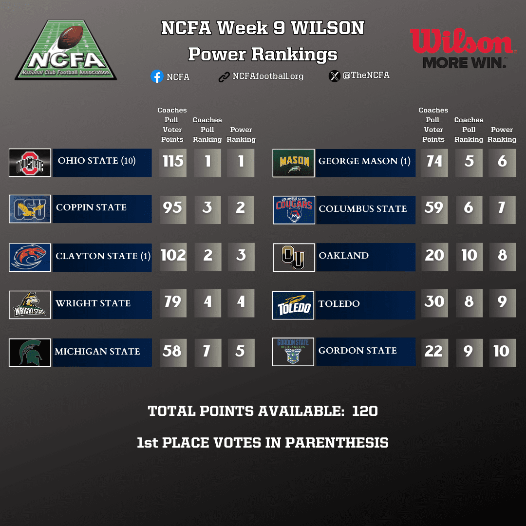After an impressive non-conference win over Cincinnati United, Wright State has climbed into the #4 spot in the Week 9 Power Rankings, while Michigan State’s conference win over Oakland has moved them into the #5 position and spot in the Great Lakes Championship game vs Ohio State.