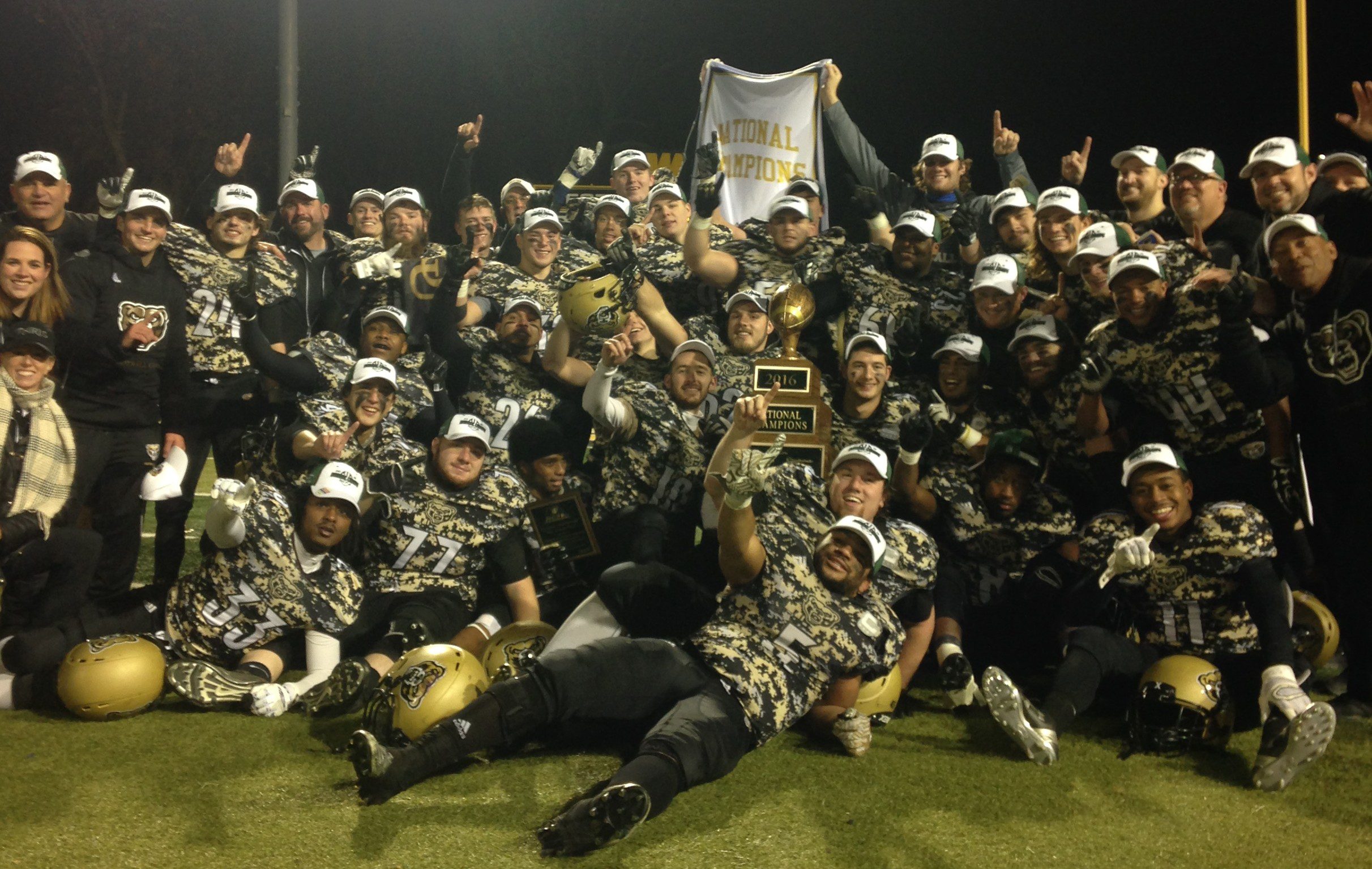 The 2016 NCFA National Championship Bowl Game was then set for #1 and undefeated Oakland to square off against #2 Middle Georgia State for the right to hoist the hardware. The game started with a quick score on an and Oakland 67 touch down pass to Raymond Artist. The Knights would answer with two touchdowns of their own and control the play the remainder of the 1st half. With just 18 seconds left to go in the half, MGA had the ball on the Oakland 3 and it looked like they were primed to punch it in and take a 21-7 lead to half time. However, Oakland’s Shakeer Williams would make a leaping one handed interception on the passing play and race down the sideline 100 yards as time expired in the half. Oakland would complete the 2 pt conversion and head to the locker room with an unexpected lead. The 2nd half would be all about the Oakland defense who would shut out MGA the remainder of the game, and the right toe of Oakland’s kicker (Chris Polite) would add 3 field goals in the 2nd half to give Oakland a 24-14 win and their 2nd NCFA National Title in the last 3 years.