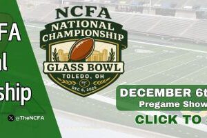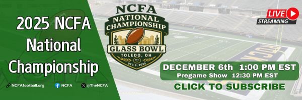 CollClubSports Media will once again be live streaming the 2025 NCFA National Championship Bowl Game on the CollClubSports.TV platform.  The CollClubSports.TV playform provides access to both live and archived games which are accessible on your computer, tablet,  or phone.  Fans will have the opportunity to watch and listen to the live simulcast produced by CollClubSports Media featuring “The Voice of CollClubSports” Ryan Norris.  Be sure you subscribe to CollClubSports.TV so that you don’t miss a minute of the National Championship Action.  Pregame show starts 30 minutes before kickoff.