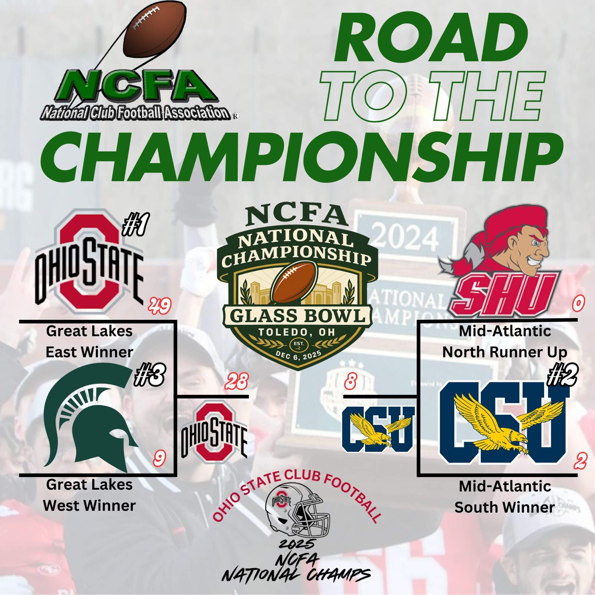 The National Club Football Association is excited to announce that the 2025 NCFA National Championship Bowl Game presented by Wilson will be held at The Glass Bowl on the campus of University of Toledo! The 2 winners from the NCFA Great Lakes and Mid-Atlantic Conference Championship Games will advance to the National Championship Bowl Game, which is set to take place Saturday, December 6th at 1:00pm EST. The winner will take home the crown as the 2025 NCFA National Champion.
